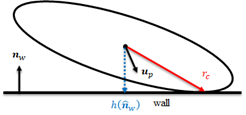 Figure 1: Example of cyclone simulation using Euler-Lagrangian method and Illustration of a non-spherical particle wall collision resulting in a torque arm between centroid and contact point.