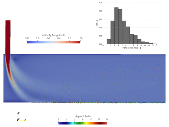 Figure 1. Particle injection with varying aspect ratios, showing velocity field contours and the experimental PDF of fibre shapes