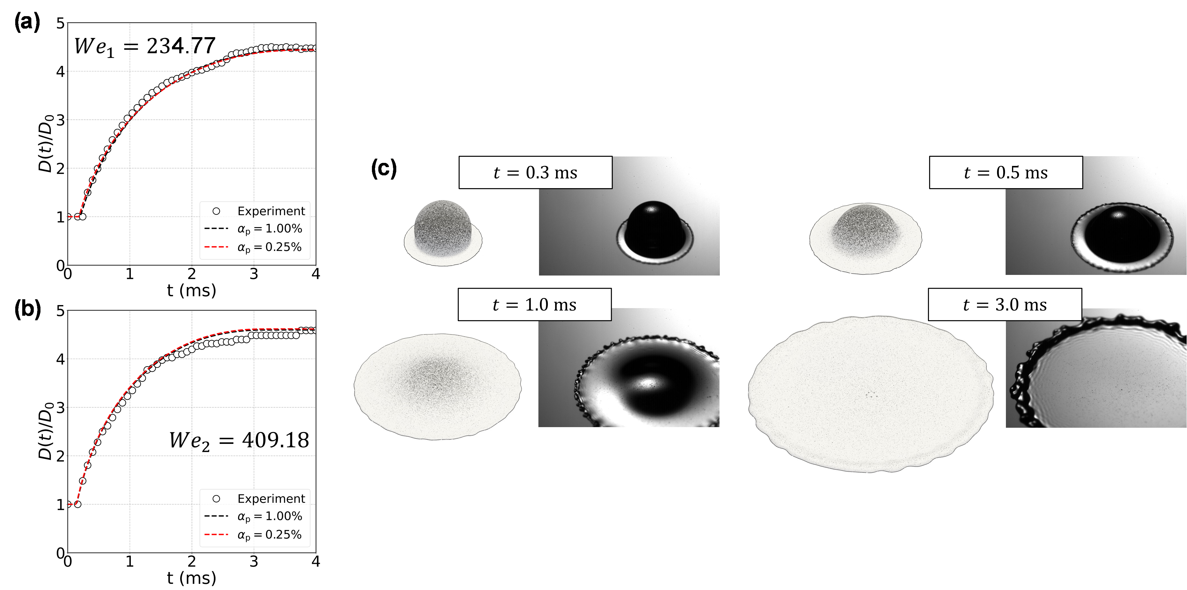 Results obtained in Tribess et al. (2025) are displayed. The impact process of water suspension droplets with a low concentration of polystyrene particles with dp=10 μm was analyzed for different droplet sizes (D0) and velocities (U0) , obtaining We=ρU02D0σ=234.77 and 409.18 (where ρ is the liquid density and σ the gas-liquid surface tension coefficient). The effect of the particle volume fraction αp on the droplet impact morphology was analyzed for αp=0.25% and 1.00% . The results are compared with experimental results obtained with high-speed imaging and the μPTV technique described in Vogelsang et al. (2025). Figures 4 (a) and (b) show the spreading factor for the different analyzed impact conditions and particle volume fractions. Nearly no influence of the particle volume fraction is observed on the spread factor evolution. A comparison between numerical and experimental results for We=234.77 and αp=0.25% for the top inclined view, showing the deposition impact outcome. Ripples near the TCL are observed in both experimental and numerical results, forming a thicker liquid film near this region.