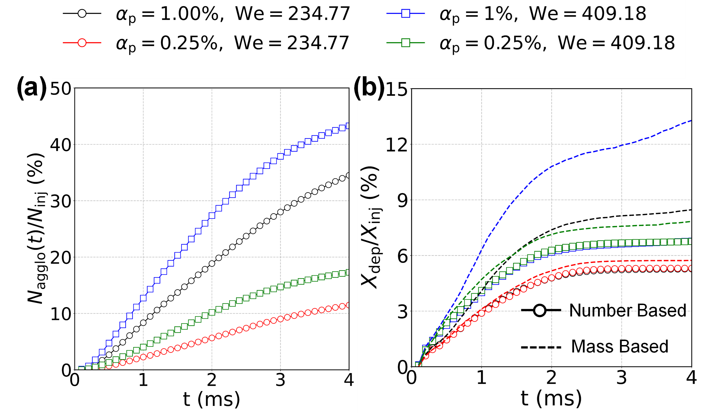Larger particle volume fractions yield on larger agglomeration rates, since a larger overall number of particle-particle collisions occur for larger particle concentrations. For the same particle volume fraction, increasing the droplet impact velocity promotes a larger number of high kinetic energy particle-particle collisions, also increasing particle agglomeration rates. Number based deposition rates are not influenced by the droplet impact velocity; however, a considerable increase is observed when increasing the droplet impact velocity. In contrast, mass-based particle deposition rates are increased for the same impact velocity and larger particle concentrations due to a larger amount of particle-particle agglomeration that occur for more concentrated suspensions. In Figure 7, particle deposition profiles are plotted with the position and time of every deposition event for We=234.77 and αp=0.25% . In Figure 7 (a), a basic particle deposition model is considered, where all particles that overcome the DLVO energy barrier are deposited at the substrate and removed from the simulation. Figure 7 (b) considers the previously mentioned particle resuspension model based on the competition between hydrodynamic and adhesive forces, with circular markers for particle deposition events where the particle stays deposited at the substrate and star markers for resuspension events.