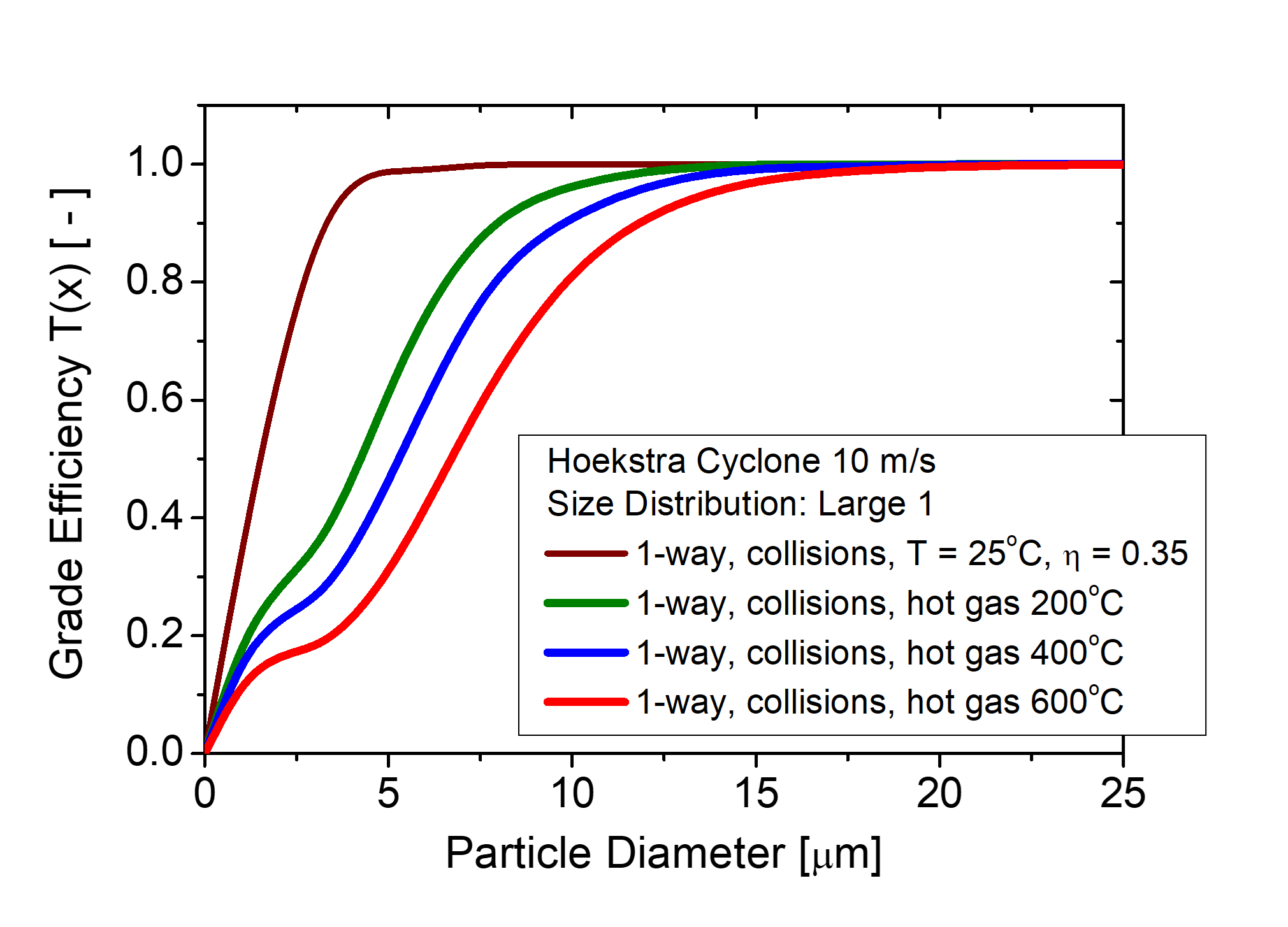 Figure 2: Grade efficiency curve of larger particles (Large1) considering different exhaust gas temperatures.
