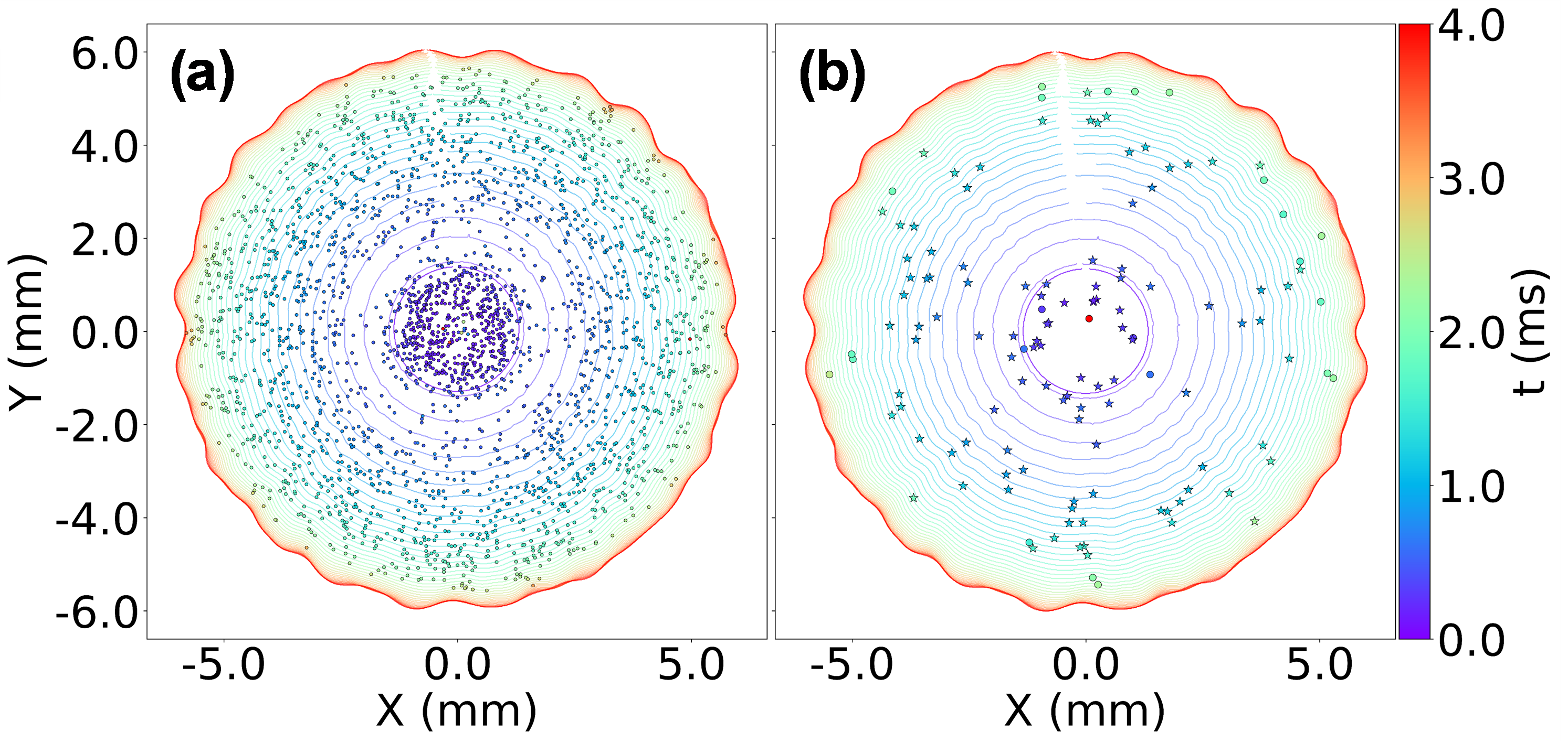 Larger particle volume fractions yield on larger agglomeration rates, since a larger overall number of particle-particle collisions occur for larger particle concentrations. For the same particle volume fraction, increasing the droplet impact velocity promotes a larger number of high kinetic energy particle-particle collisions, also increasing particle agglomeration rates. Number based deposition rates are not influenced by the droplet impact velocity; however, a considerable increase is observed when increasing the droplet impact velocity. In contrast, mass-based particle deposition rates are increased for the same impact velocity and larger particle concentrations due to a larger amount of particle-particle agglomeration that occur for more concentrated suspensions. In Figure 7, particle deposition profiles are plotted with the position and time of every deposition event for We=234.77 and αp=0.25% . In Figure 7 (a), a basic particle deposition model is considered, where all particles that overcome the DLVO energy barrier are deposited at the substrate and removed from the simulation. Figure 7 (b) considers the previously mentioned particle resuspension model based on the competition between hydrodynamic and adhesive forces, with circular markers for particle deposition events where the particle stays deposited at the substrate and star markers for resuspension events.